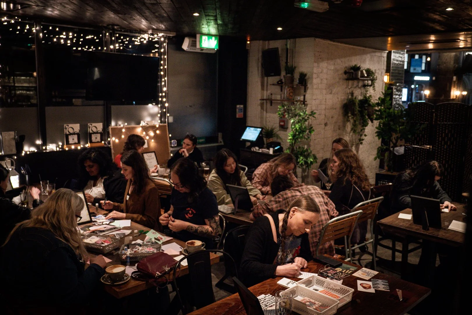 The evening opened with an indie film screening, setting a reflective and creative tone before transitioning into informal networking. Alongside this, the event featured an art exhibition showcasing work by local artists, who were given the opportunity to both display and sell their work directly to audiences. A zine-making station and additional craft activities were available throughout the night, encouraging hands-on creativity and playful interaction alongside conversation.